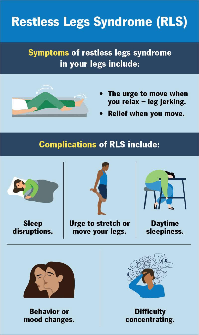 Restless legs syndrome (RLS) is a brain, nerve and sleep condition that causes a strong, nearly irresistible urge to move your legs that’s at least partially relieved by movement. Symptoms are more common when your body is at rest in the evening. It usually occurs in addition to uncomfortable sensations in your legs like throbbing or aching. The urge to constantly move can interfere with your ability to relax or fall asleep.
