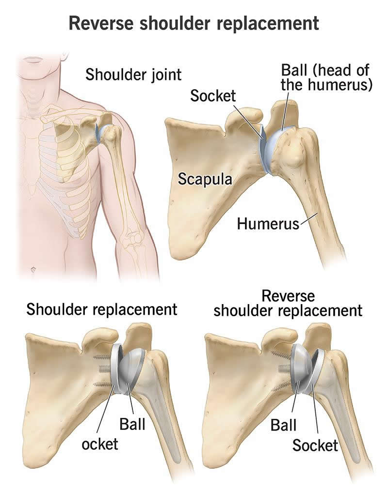 Reverse shoulder replacement gets its name from how the prosthetic joint fits into your shoulder. Your surgeon will flip-flop the usual place of the ball and socket. After surgery, the ball will stick out from your scapula and fit into a socket at the top of your humerus (the reverse of the usual alignment).