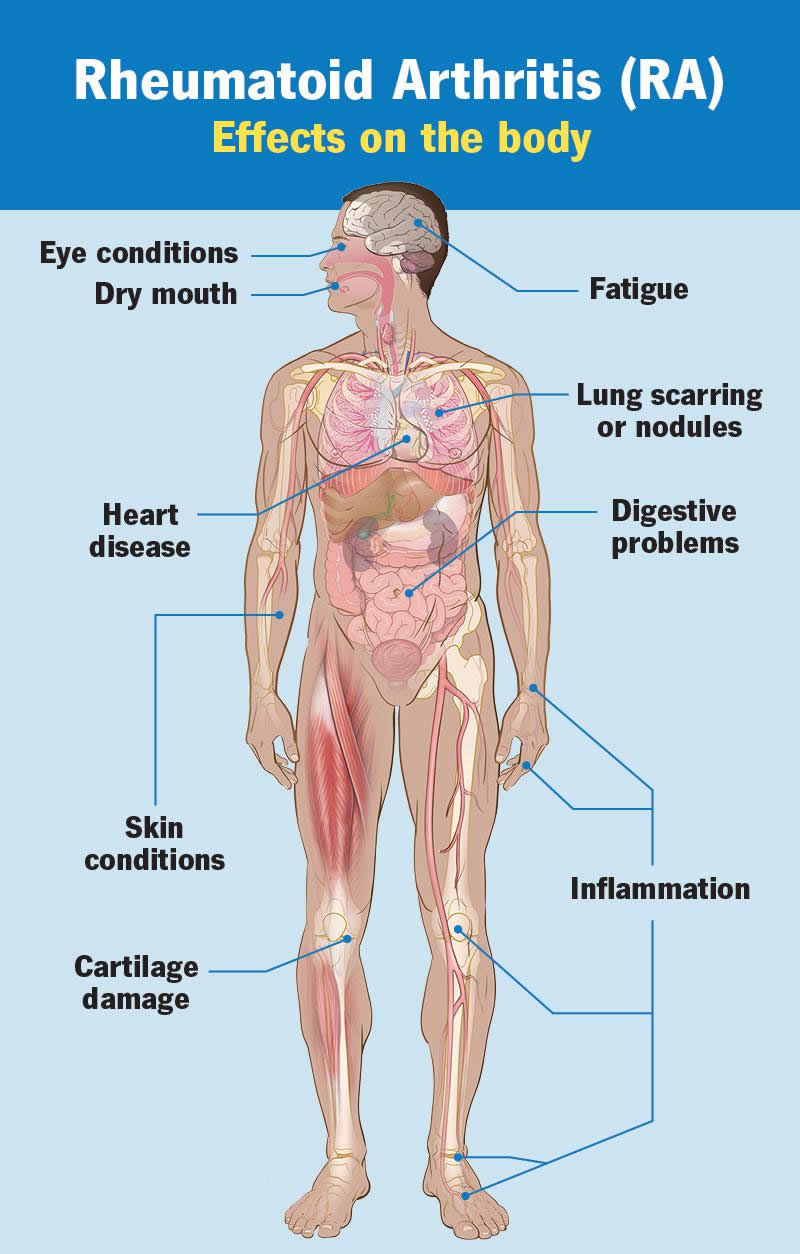 Specific cells in your immune system (your body’s infection-fighting system) aid this process. These substances are produced in your joints but also circulate and cause symptoms throughout your body. In addition to affecting your joints, rheumatoid arthritis sometimes affects other parts of your body, including your: