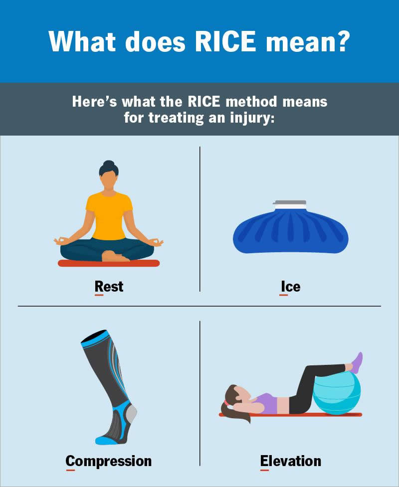 The RICE method is a common protocol for taking care of musculoskeletal injuries. RICE stands for Rest, Ice, Compression and Elevation. These steps can help reduce inflammation, swelling, pain and bleeding in your soft tissues. RICE is good for immediate relief, but healthcare providers have different recommendations after the acute phase.