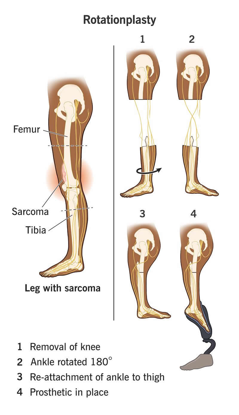If you have to lose the middle part of your leg, you’ll have two main choices before you: amputate the leg from the middle down, or save the lower part and attach it to the upper part. This is rotationplasty. The “rotation” part comes in because your surgeon rotates the lower part of your leg 180 degrees before reattaching it.