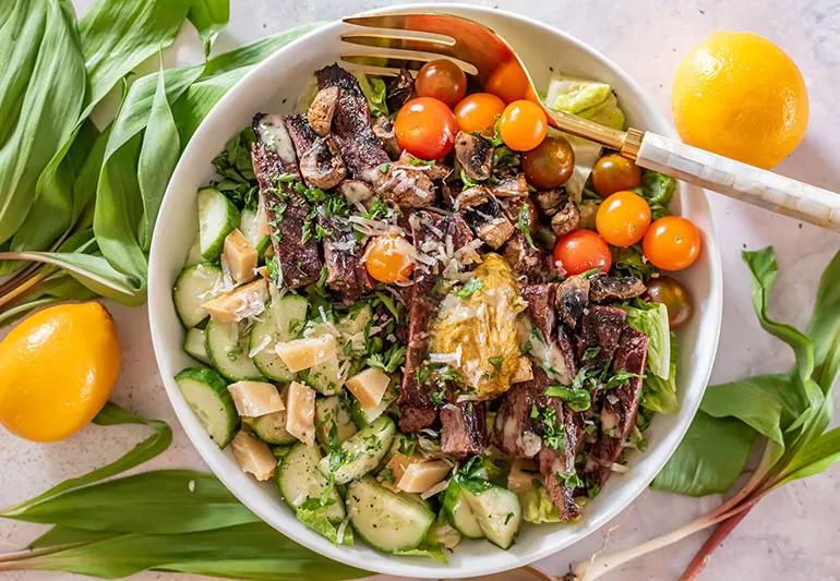 This recipe for California Kale Cobb Salad includes artichoke hearts, avocado and turkey bacon. It’s a hearty offering loaded with healthy fats and plenty of protein.
