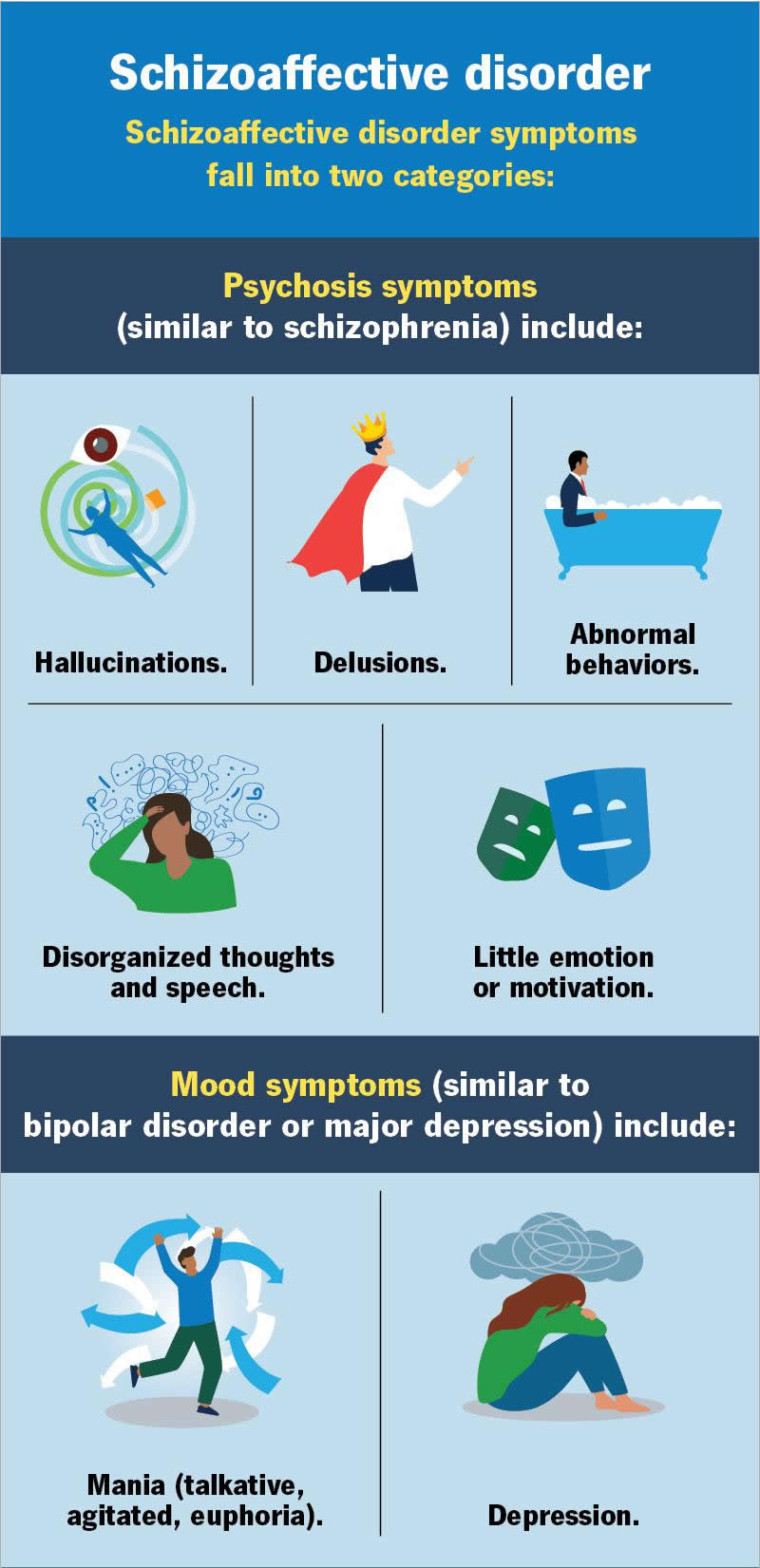 Schizoaffective disorder is a mental health condition with symptoms of schizophrenia and a mood disorder. People with schizoaffective disorder may experience depression, mania and psychosis. Schizoaffective disorder treatment often includes therapy and medications. This combination can improve symptoms and quality of life.