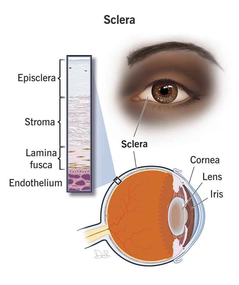 The random pattern of collagen fibers layered on top of each other makes your sclera white. They’re stacked crisscrossing over each other so they don’t let as much light through as other parts of your eye. For example, collagen fibers in your cornea (the clear part at the front of your eye) are neatly organized, which makes them clear enough for you to see through.
