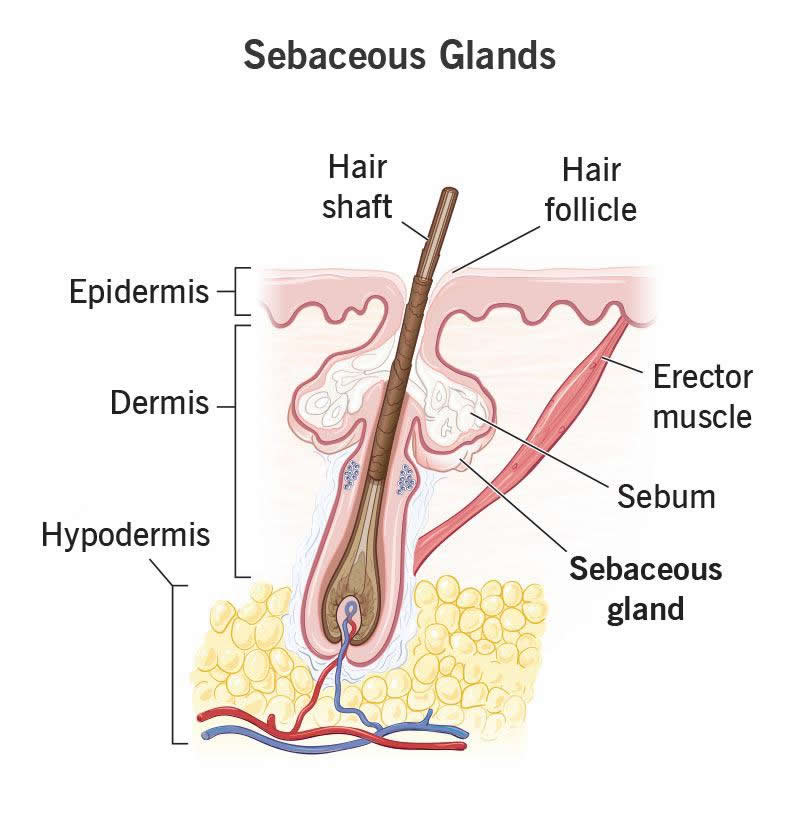 Sebaceous glands are responsible for producing and secreting sebum. Sebum is an oily substance made up of fat molecules (lipids) that include: