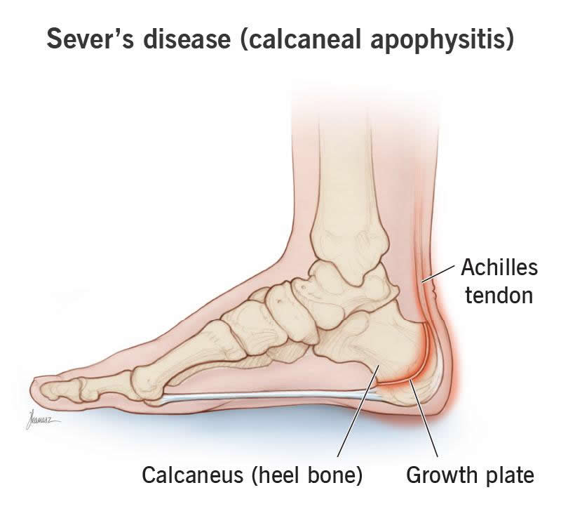 Sever’s disease (calcaneal apophysitis) is a type of repetitive strain injury in your child’s heel. Too much strain from activities on their feet causes inflammation in the bone. Your child’s bones are softer when they’re growing, so they’re easier to injure. They’ll need to back off of activities that put stress on their heel until the condition improves.