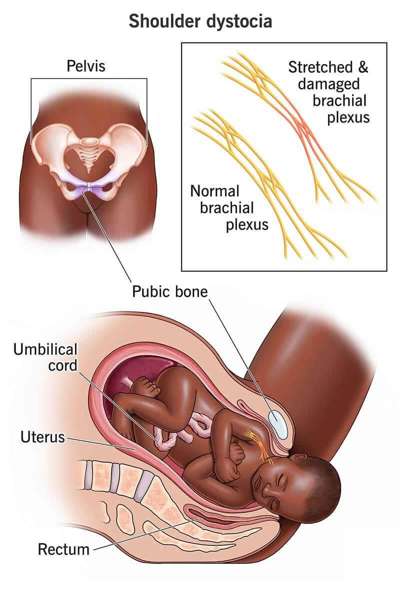 The most common complication of shoulder dystocia in your baby is brachial plexus palsy. The brachial plexus nerves run from your baby’s spinal cord in their neck through their arm. These nerves are responsible for providing feeling and movement in your baby’s shoulder, arm and hand. Damage to these nerves can cause weakness and paralysis on the affected side. Other complications to your baby may include: