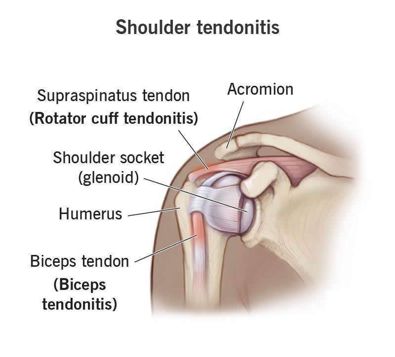 Shoulder tendonitis (tendonitis) is inflammation that affects an area within your shoulder joint. Your shoulder joint is kept stable by a group of muscles called the rotator cuff, as well as the biceps tendon. These muscles and tendons keep your upper arm bone (humerus) within your shoulder socket (glenoid).