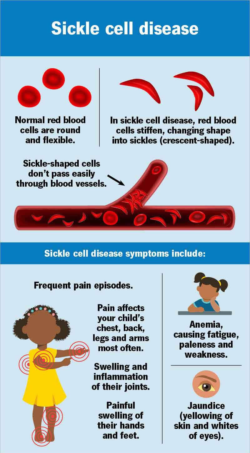 Sickle cell disease (SCD) is a genetic blood disorder. It causes your red blood cells to form into a “C” shape — like a crescent moon, or a farm tool called a sickle. These sickled blood cells can stick together and keep oxygen from getting to your tissues and organs. This can cause episodes of pain and life-threatening complications.