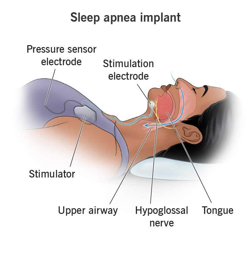 A sleep apnea implant is a surgically implanted device that opens your upper airway as you sleep. It treats symptoms of obstructive sleep apnea. It works by activating the hypoglossal nerve that moves your tongue. It pushes your tongue forward so it’s out of your airway when you breathe.