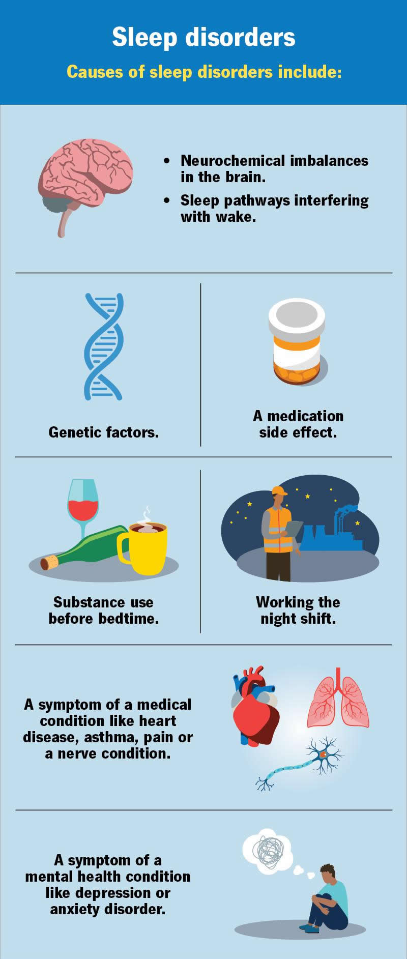 A disruption to your body’s cycle of sleep and daytime wakefulness causes sleep disorders. Specific things may cause this to happen, and it varies based on the type of sleep disorder you have. They may include: