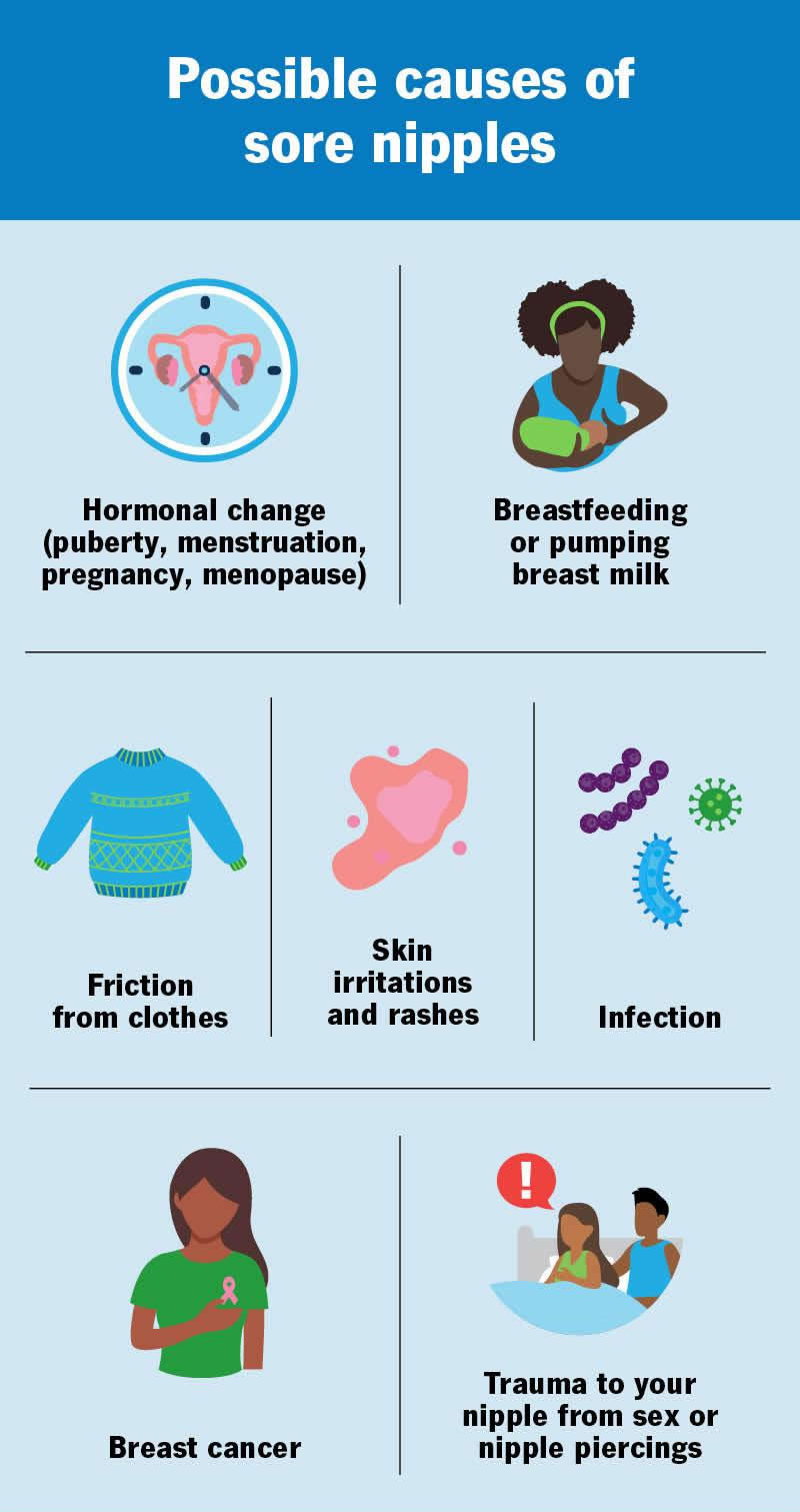 There are many possible causes of sore nipples — from menstruation, pregnancy and nursing to skin irritants and infections. Treatment might be as simple as using a different soap or applying ointment. But certain causes, like mastitis, abscesses and breast cancer, need medical attention. When in doubt, seek medical care.