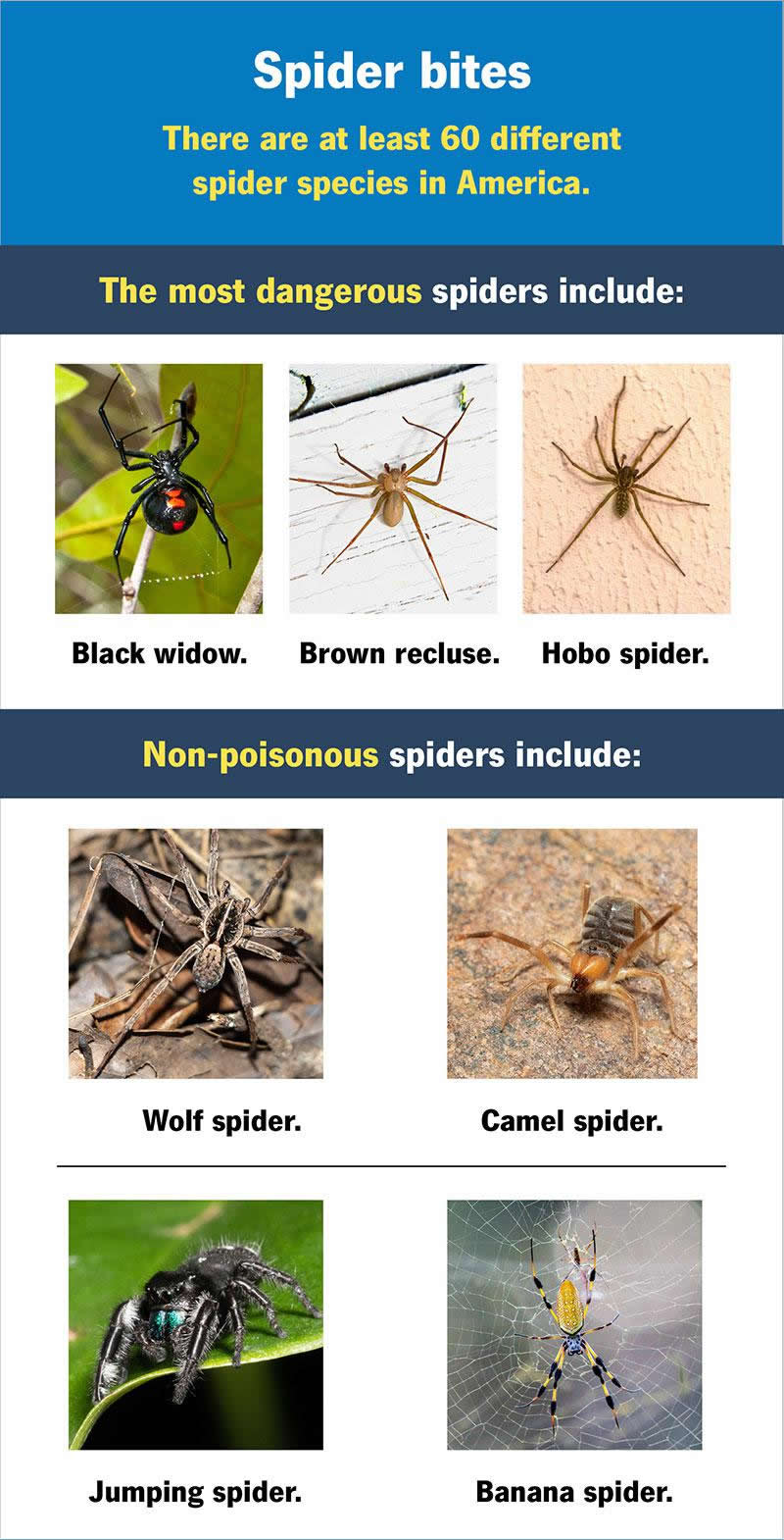 There are almost 50,000 different spider species around the world. While most spiders are too small and their venom too weak to cause any danger to humans, they’ll still bite when they feel threatened. In the U.S., nonpoisonous spider bites include: