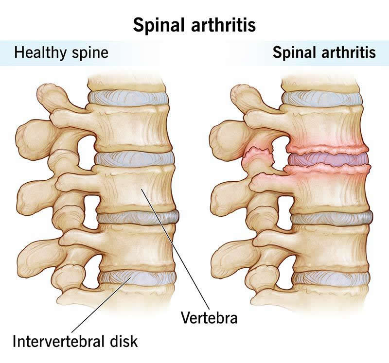 Spinal arthritis is inflammation in the joints between your vertebrae, the bones that link together to make your spine. Just like arthritis in other joints, there are several types of spinal arthritis. It can affect any section of your spine, but it’s most common to have spinal arthritis in your neck or lower back.