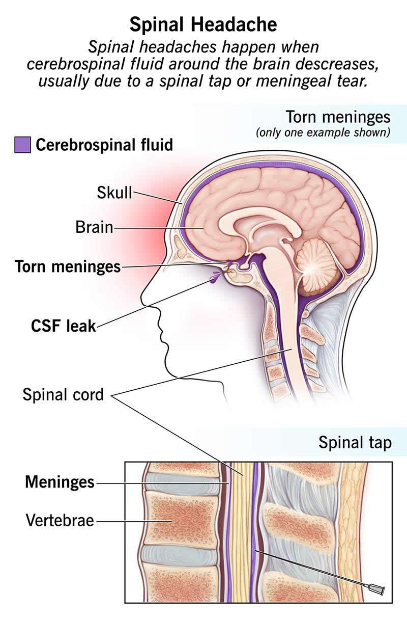 A spinal headache is an intense headache that happens when the amount of cerebrospinal fluid (CSF) around your brain decreases. It can result from a spinal tap (lumbar puncture) or if CSF leaks out due to a cyst or tear in the meninges that cover your spinal cord.