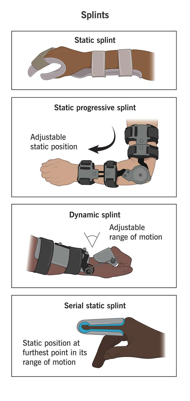 - Static progressive splints: The splint doesn’t let you move, but it’s adjustable. Your provider may adjust its position over time to stretch your body or change the splint’s position while you heal.