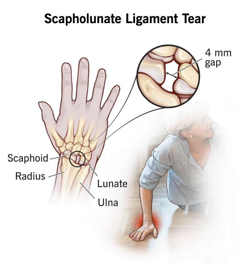 There are 20 ligaments in your wrist that support your eight wrist bones. A sprained wrist happens when something stretches your wrist ligaments enough to damage them. The scapholunate ligament that connects your scaphoid and lunate bones is the most commonly sprained ligament.