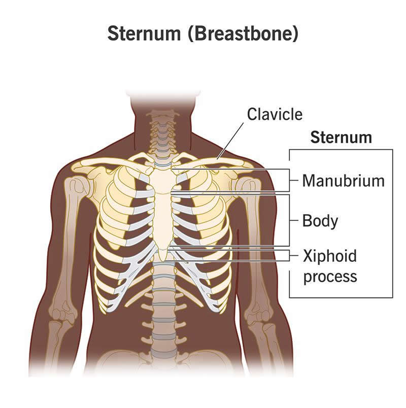 Your sternum, or breastbone, is a flat, vertical bone at the center of your chest that protects your organs and muscles. It connects to other bones and muscles and forms part of your ribcage, which protects your heart and lungs. Many different conditions can cause sternum pain, but most aren’t serious. See your provider if you have any concerns.