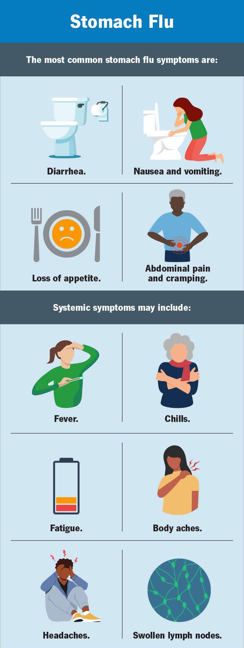 Influenza causes respiratory symptoms like congestion, a sore throat or a runny nose. Stomach flu causes gastrointestinal symptoms, like diarrhea, nausea and vomiting. Both may cause “systemic symptoms” like fever and fatigue. Children may have some gastrointestinal symptoms with both.