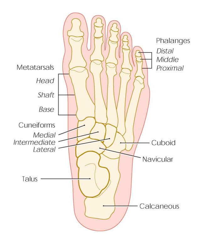 - Foot (especially your metatarsals that connect your ankle and heel to your toes).