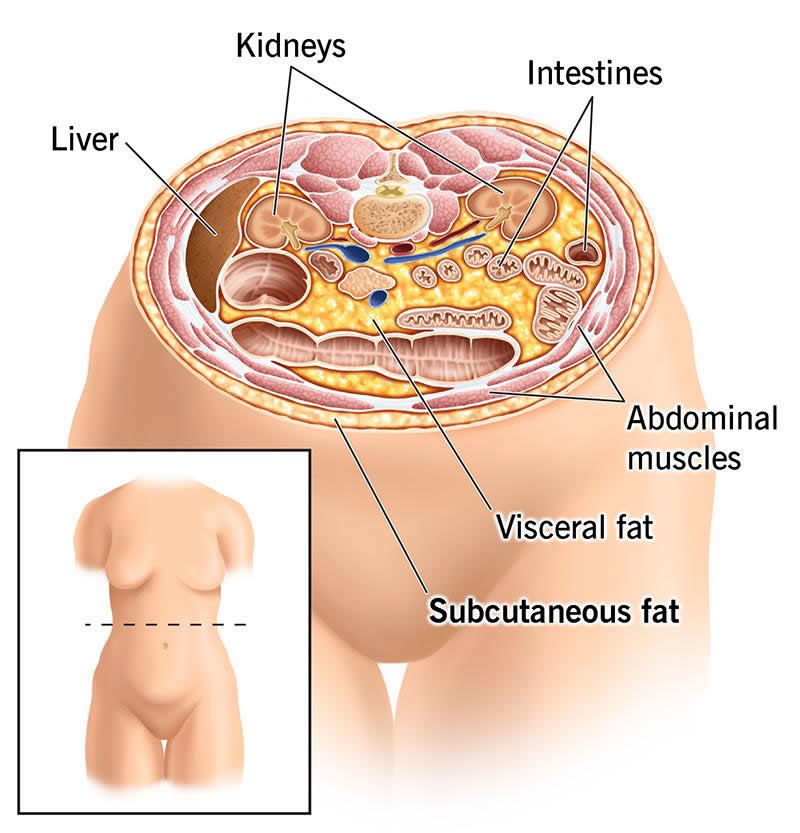 Visceral fat is fat that lies deep within your abdominal organs and can’t be seen from the outside. It surrounds your stomach, liver, intestines and other important organs. Subcutaneous fat is different. Subcutaneous fat is the fat just under your skin. It’s the kind that you can grab and pinch between your fingers. Subcutaneous fat collects mainly around your hips, butt, thighs and belly.