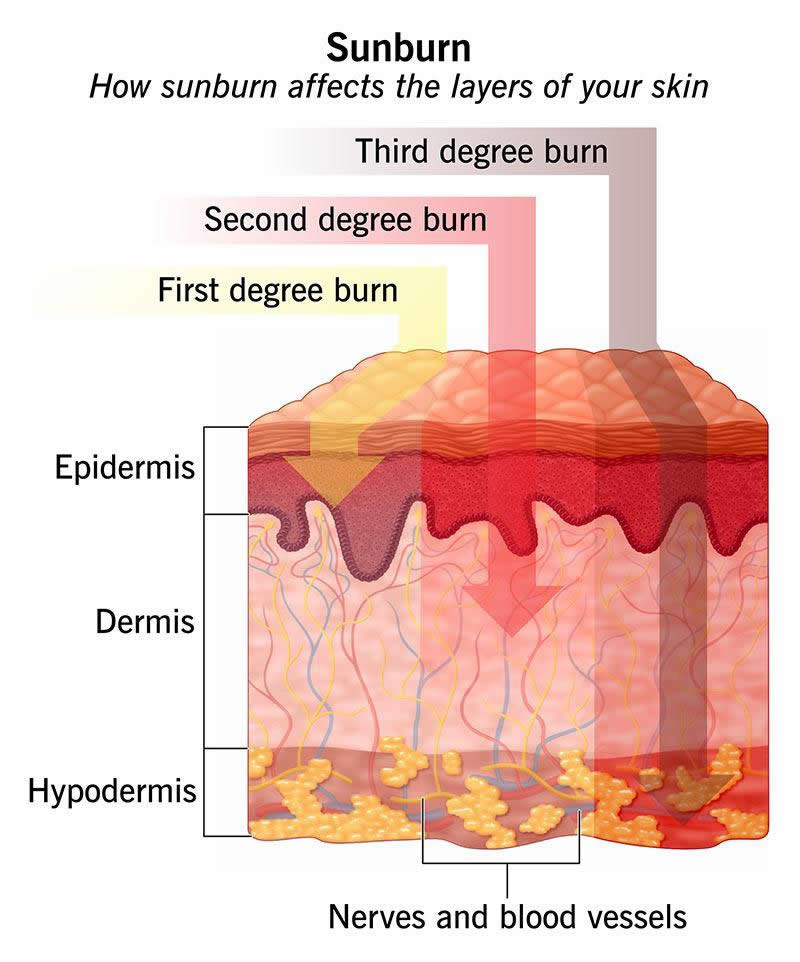 When your skin becomes sunburned, your skin’s blood vessels dilate, which leads to redness, inflammation and swelling. Your body sends immune cells to repair the damage. Some skin cells can be repaired and some die off. Others may have DNA mutations that can’t be fixed. These effects age your skin and can lead to skin cancer.