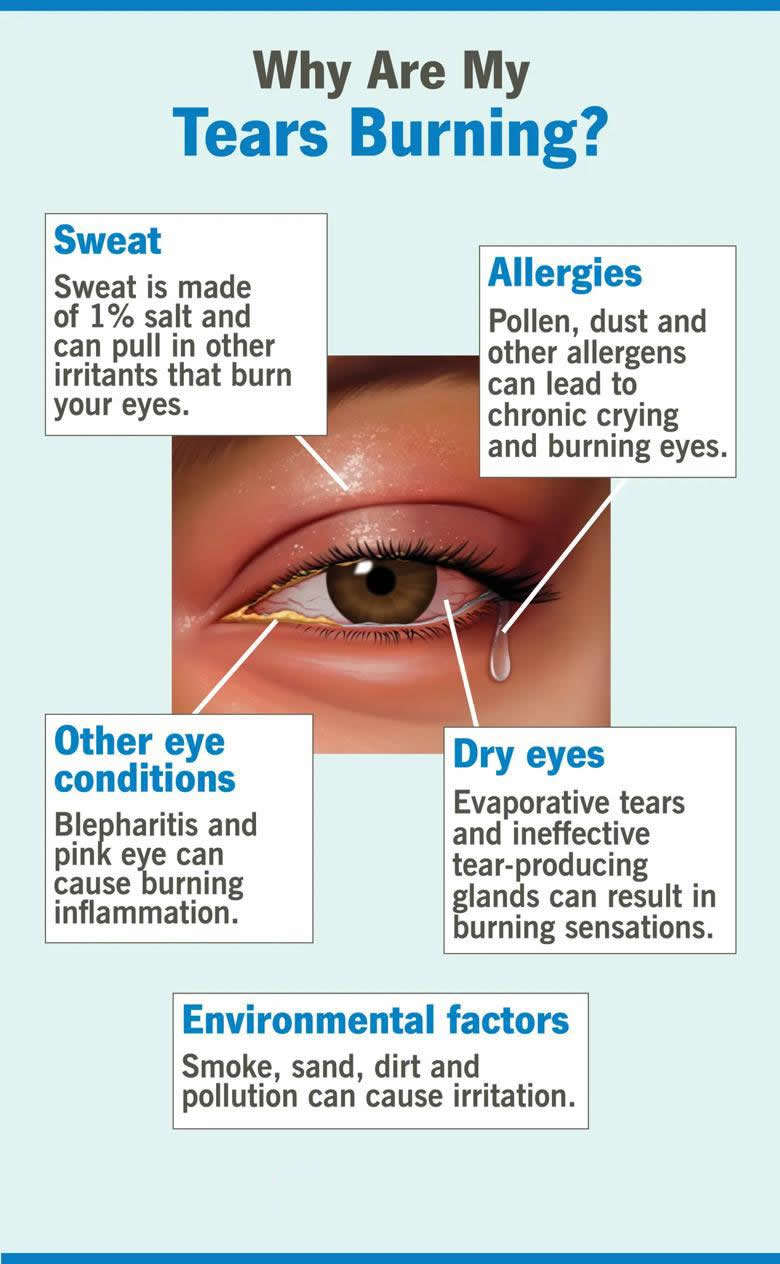 Eye conditions that cause inflammation can lead to burning tears, too. A common one is blepharitis, or inflammation of your eyelids. It can result from an infection or when oil glands become clogged (so you’re more likely to get blepharitis if you have naturally oily skin).