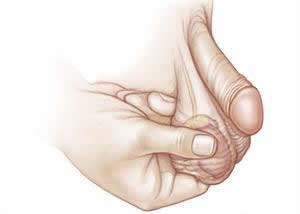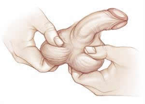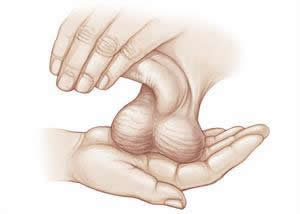 - Use both hands to examine each testicle. Place your index and middle fingers underneath the testicle with your thumbs on top. Roll each testicle between your thumbs and fingers.