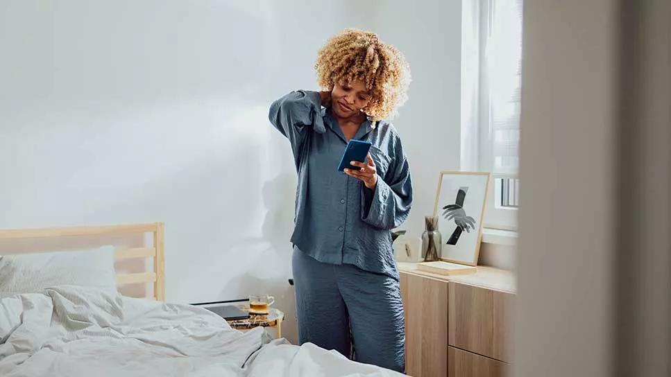 Speaking of alarms: Another practice is to set intentional limits on your phone usage. While it may feel like it’s close to impossible to completely limit using your smartphone, remember to take breaks or limit usage to shorter amounts of time. A good rule of thumb is to take a break every 15 to 30 minutes to help give your back and neck a break.