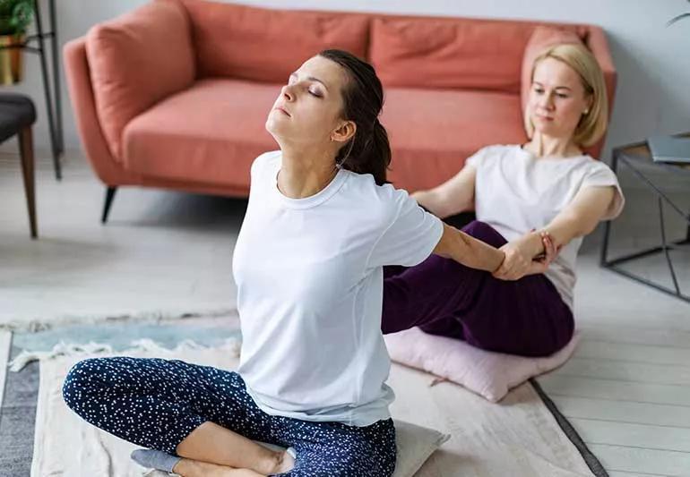Instead, your therapist helps you perform passive stretches and yoga poses to promote well-being by using their body to assist and guide you throughout. Your massage therapist may use their hands, elbows, forearms and feet to help reduce tension in your muscles.