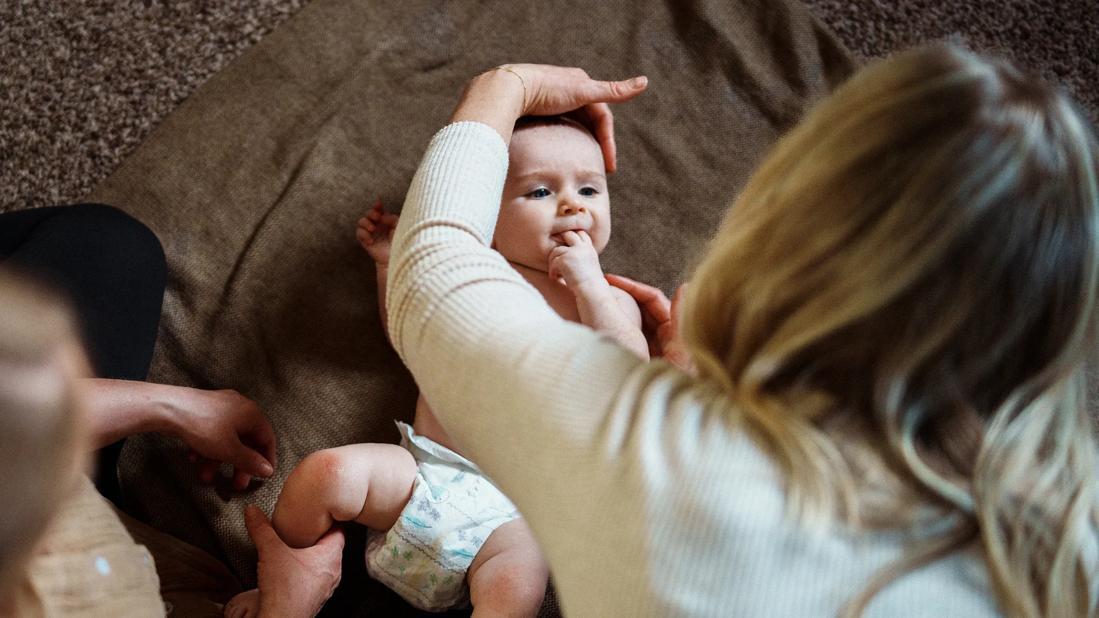 - Slowly help your baby turn their head to the right (cheek toward the floor).