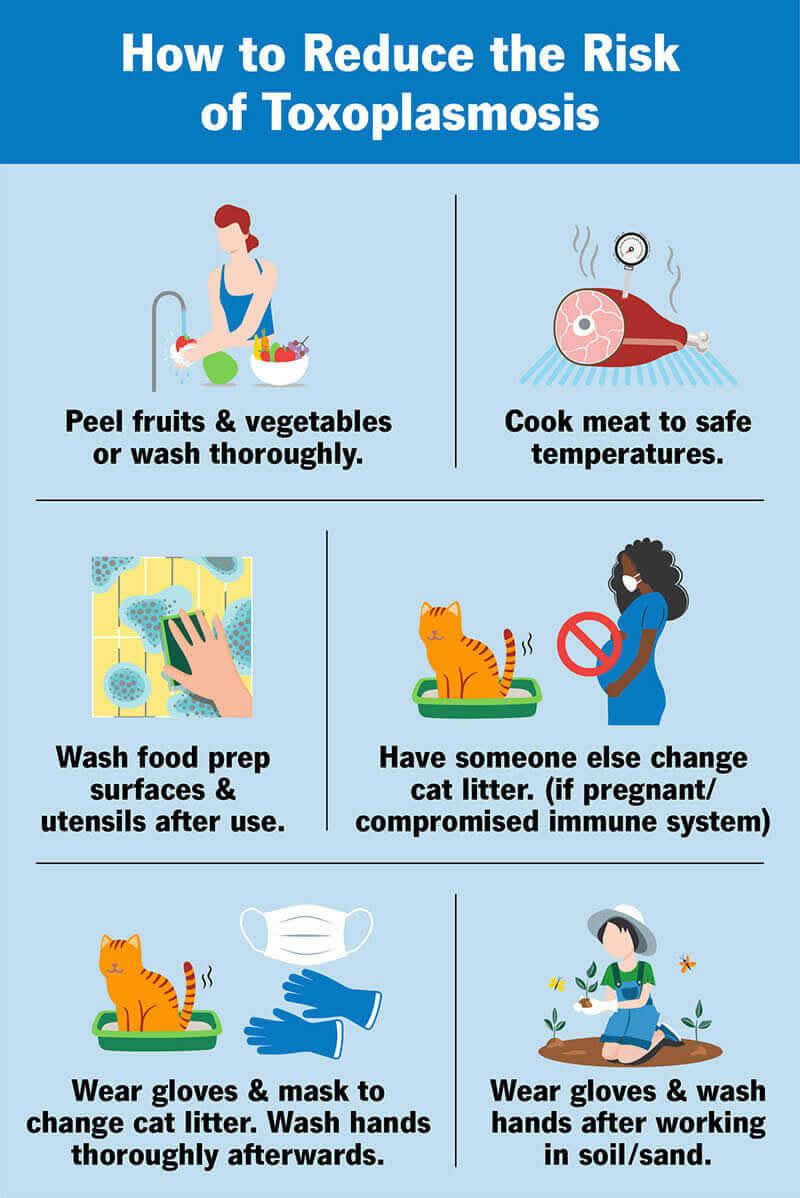 Keeping your cat indoors, having someone else change the litterbox frequently and not feeding your cat raw or undercooked meat all reduce the risk of you and your cat getting toxoplasmosis. If you do have to change the litterbox, wear gloves and a mask and wash your hands immediately after.