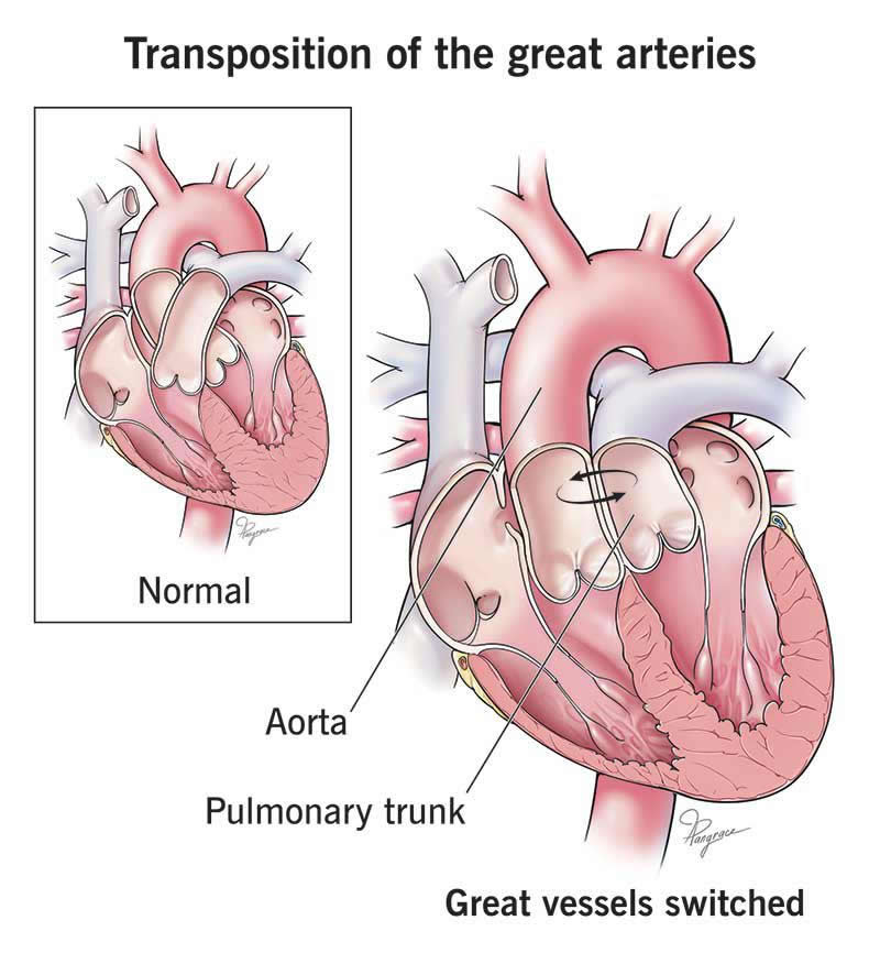 Transposition of the great arteries is a congenital heart condition that happens when the two main arteries going away from your heart are in the wrong places. For many babies with this condition, it affects blood oxygen levels and can be life-threatening without surgery to repair it. But the surgery has a very high survival rate.