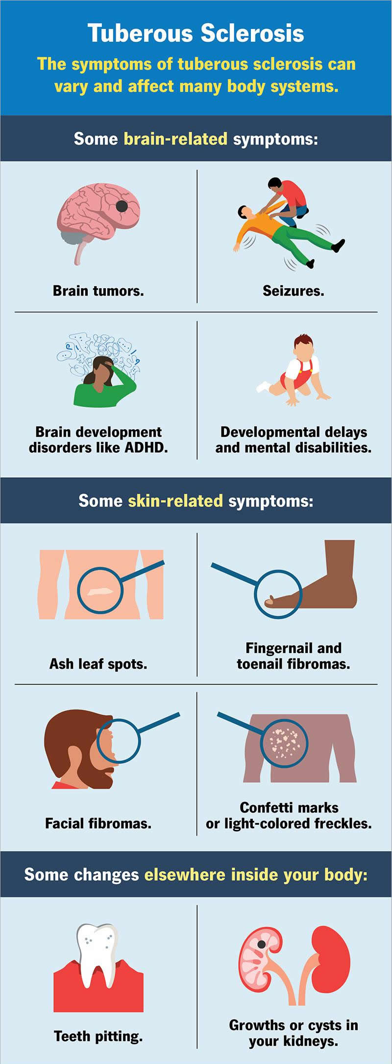 The symptoms of tuberous sclerosis can vary greatly depending on the organs or body parts affected. Symptoms tend to fall under the following categories: