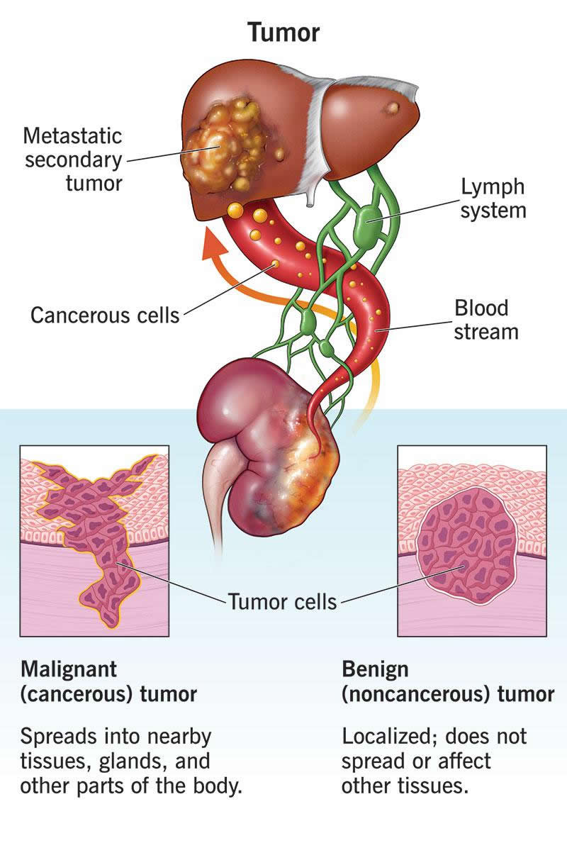 - Malignant (cancerous) tumors:This type can spread into nearby tissue, glands and other parts of your body. The new tumors that have spread are called metastases, or “mets,” and can come back after treatment. Some malignant neoplasms are curable, while others are life-threatening.