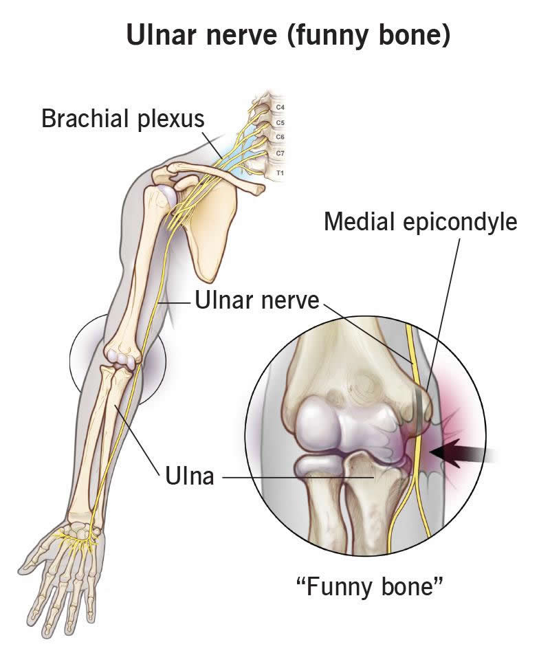 Your ulnar nerve runs underneath the first layer of skin near your elbow. When you bump your elbow against a hard surface, you may temporarily pinch your ulnar nerve. The impact causes a funny-feeling, shock-like tingling or burning known as “hitting your funny bone.”