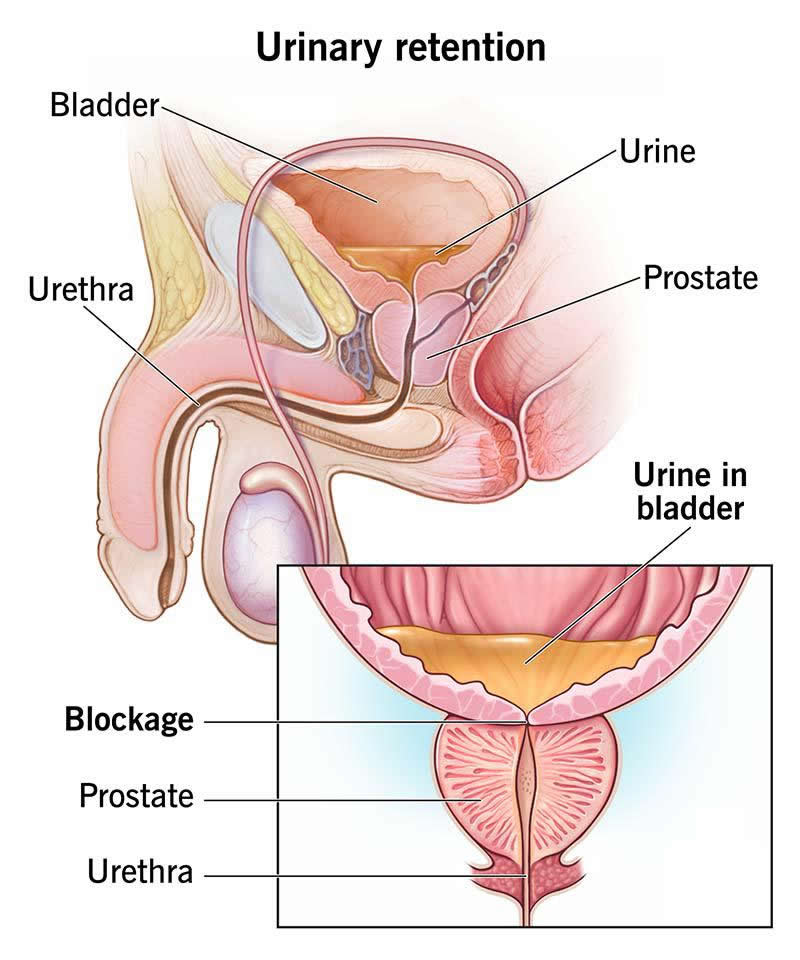 - Enlarged prostate: A blockage can happen when their prostate gland gets so big that it presses on their urethra.