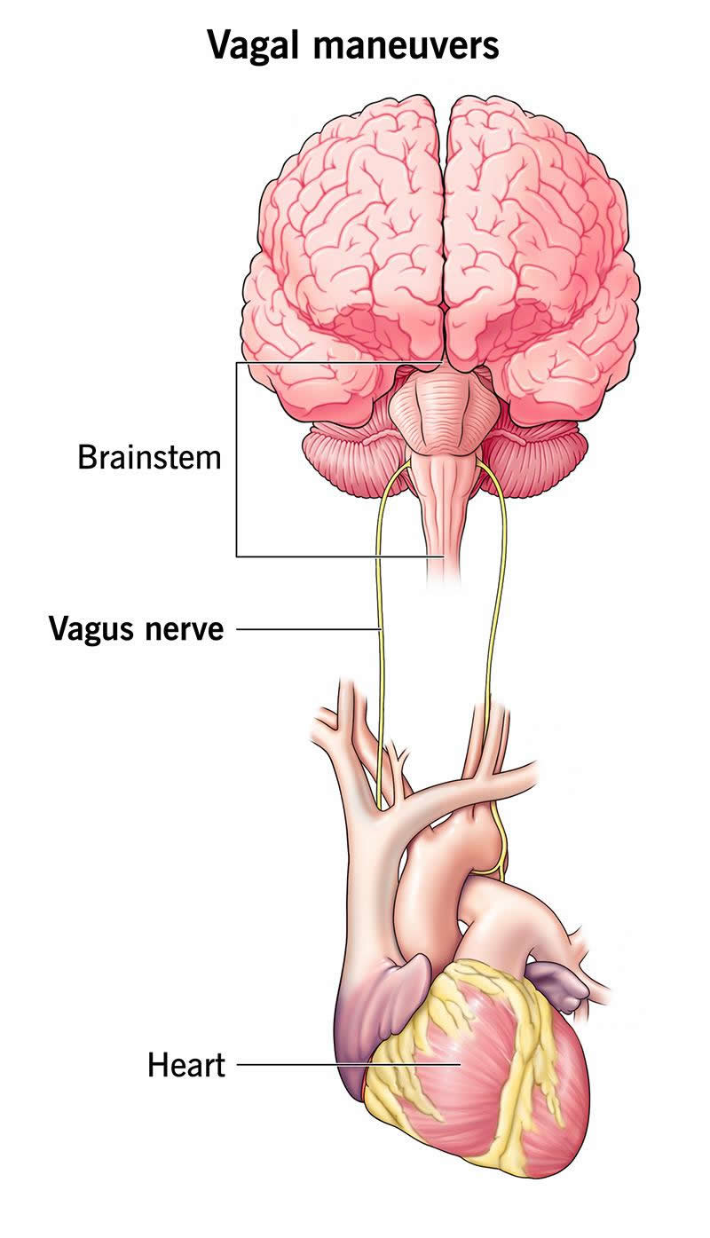 Vagal maneuvers are physical actions that make your vagus nerve act on your heart’s natural pacemaker, slowing down its electrical impulses. Your vagus nerve — which goes from your brainstem to your belly — plays a major role in your parasympathetic nervous system, which controls a number of things in your body, including heart rate.