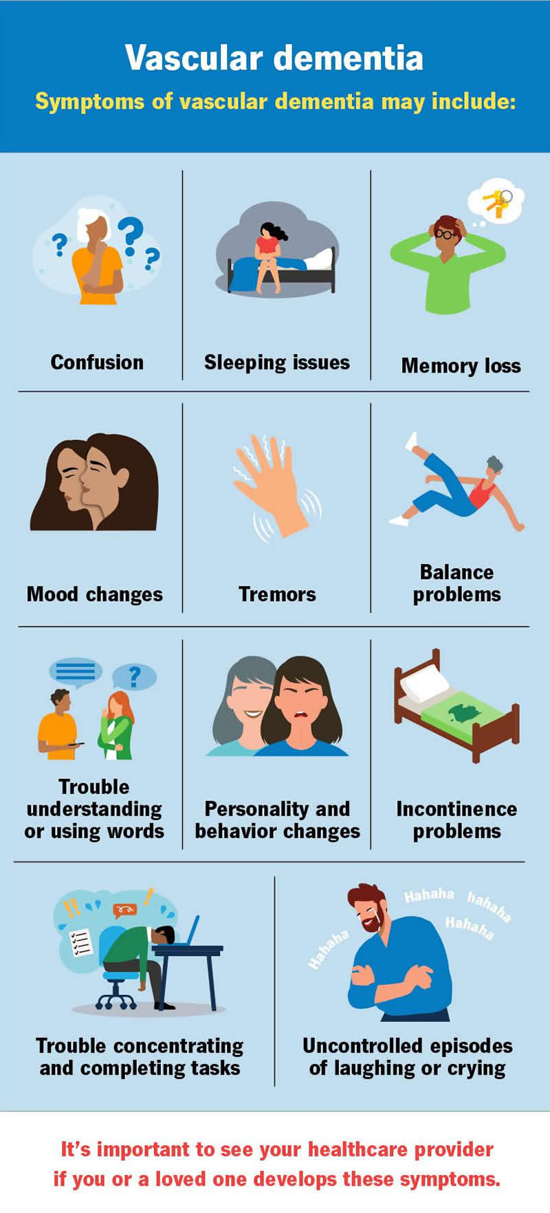Symptoms of vascular dementia can vary widely. They depend on which parts of your brain it damages and how severe it is. Symptoms may include: