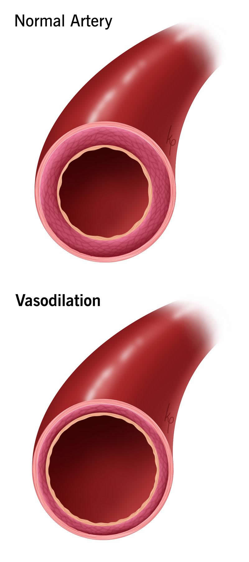 There’s a wide range of medications that cause vasodilation, either as their main purpose or as a side effect. Many types of blood pressure medications cause vasodilation because that’s their main purpose. Another common medication that causes vasodilation is nitroglycerin, which makes it useful in the treatment of heart attack and chest pain. Erectile dysfunction medications like sildenafil (Viagra®) also rely on vasodilation.