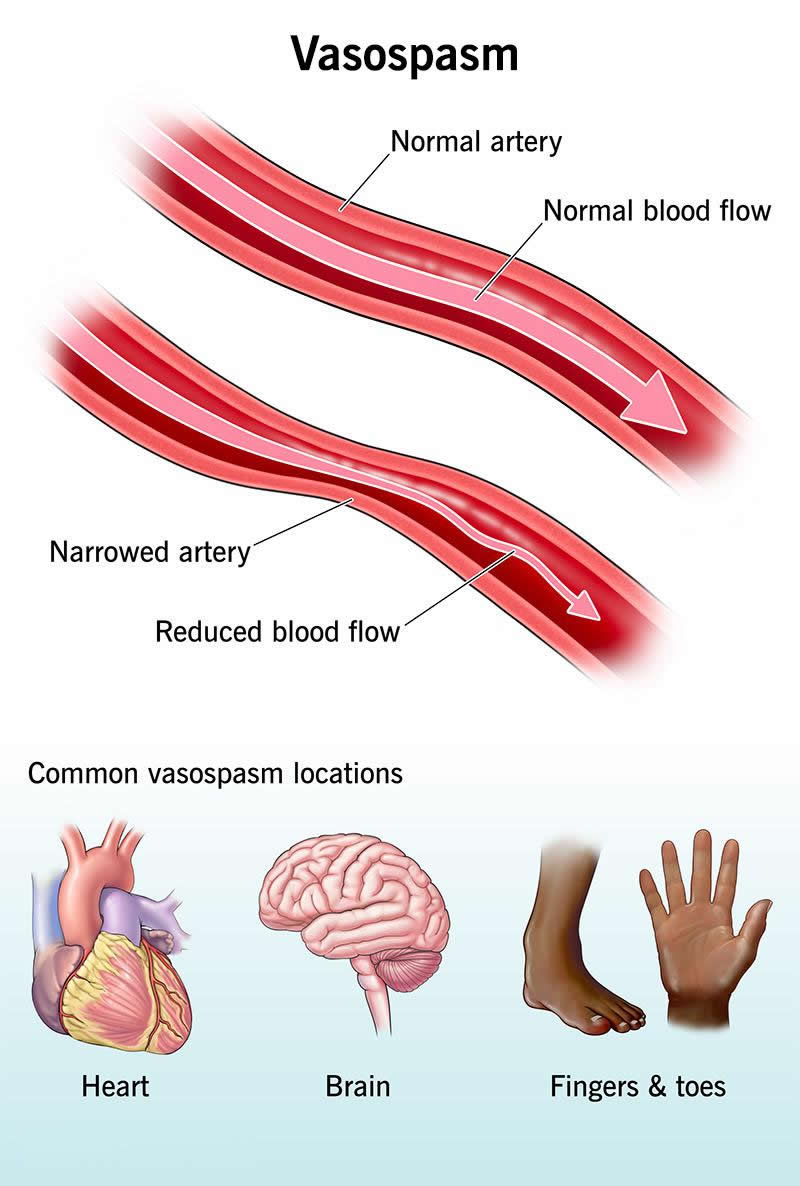 Your arteries expand and contract their muscular walls regularly to help control the pressure of blood moving through them. Because vasospasms last longer than a normal constriction, they can damage the layers of your artery walls. It’s like clenching your fists for too long.
