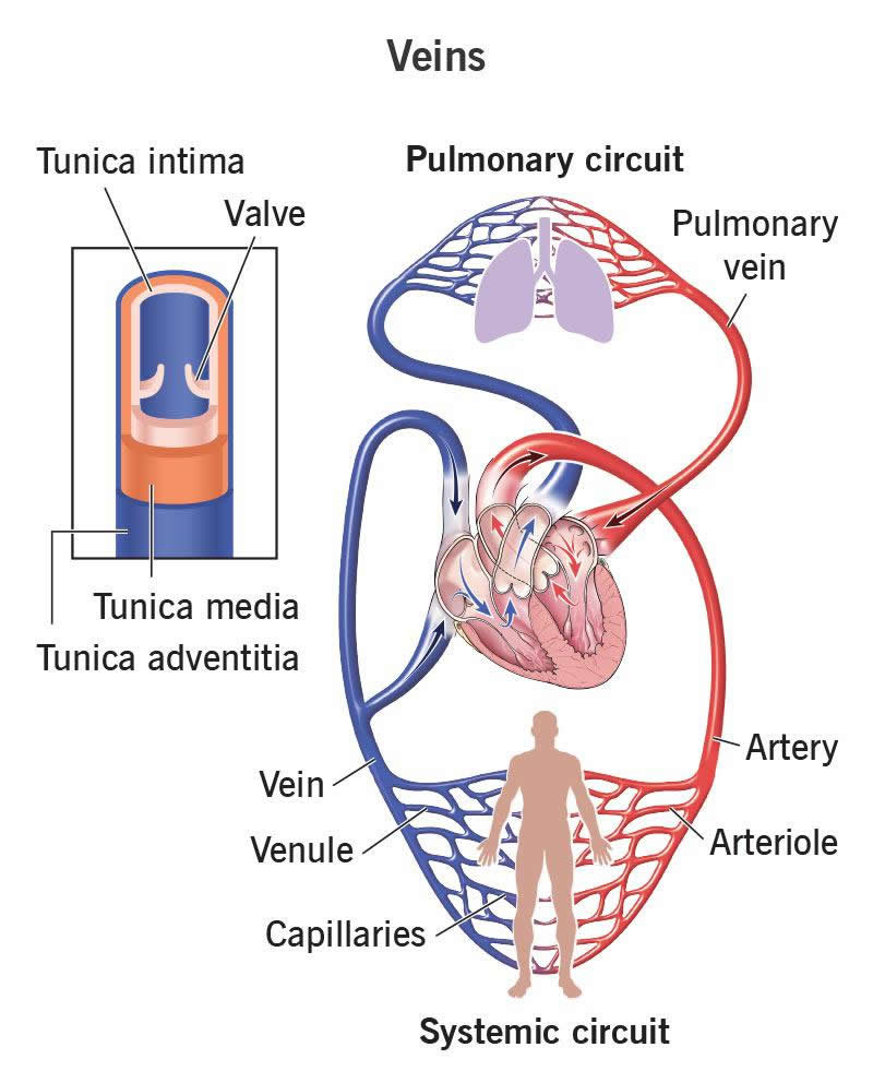 Veins and arteries share this general structure. However, veins are different from arteries because they sometimes also contain one-way valves that keep blood flowing in the right direction. These valves are especially important in your legs, where they help blood move up toward your heart. If these valves get damaged, blood can leak backward and cause varicose veins or other problems.