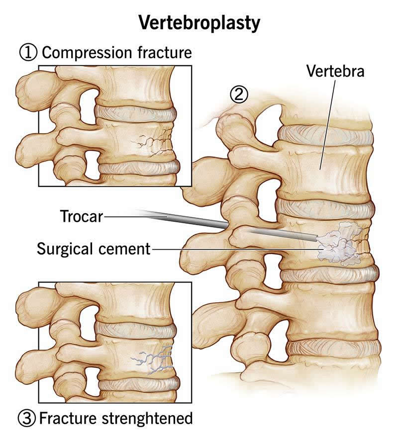 Vertebroplasty is a minimally invasive outpatient procedure to treat spinal compression fractures. Compression fractures are breaks in the bones that make up your spine (vertebrae). When the broken pieces of bone rub together, it causes pain. Vertebroplasty uses surgical cement to hold your bones in place to prevent them from collapsing and provide pain relief.