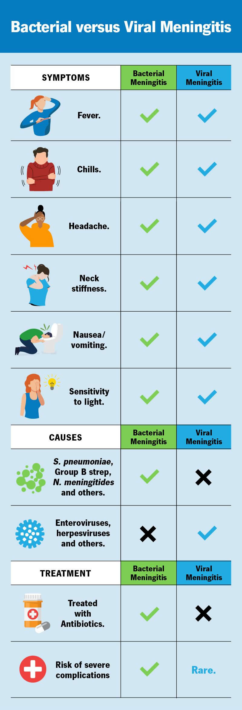 Viral meningitis and bacterial meningitis both cause inflammation of your meninges, but different infectious agents (germs) cause them. Viral meningitis usually resolves on its own. Bacterial meningitis can be fatal. There’s no way to know the difference without being evaluated by a healthcare provider. Go to the ER or seek emergency medical attention right away if you think you have meningitis.