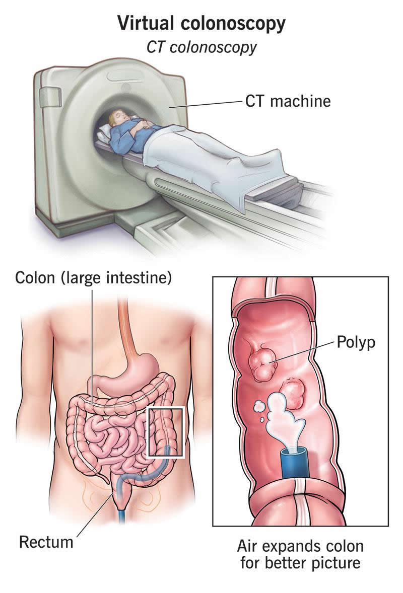 A virtual colonoscopy is a CT scan that looks for polyps or cancer in your colon and rectum. This test uses highly detailed 3D images to see the entire length of your colon. The test is about 15 minutes long, and you don’t need sedation.