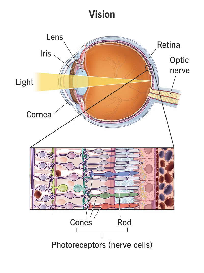 Your retinas are highly specialized, very sensitive cells called photoreceptors (meaning “light receivers”). When light hits them, it triggers chemical and electrical reactions in the cells. That’s how those cells convert light and encode them into nerve signals.
