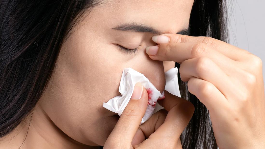 “Lean forward and pinch the nostrils for at least five minutes without stopping,” says Dr. Appachi. “Many people stop applying pressure after a minute or two before the blood has clotted. Resist the urge to let go too soon.”