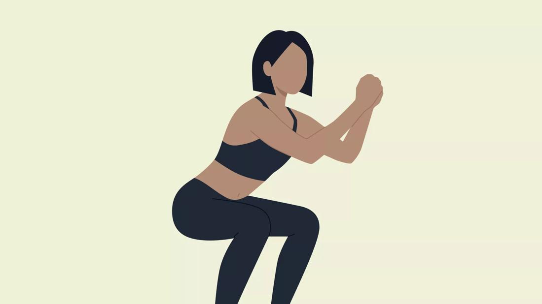 - Walk your feet out and lower down into a sitting (or squatting) position. If you can, your knees should be bent to 90 degrees, with your thighs parallel to the floor.