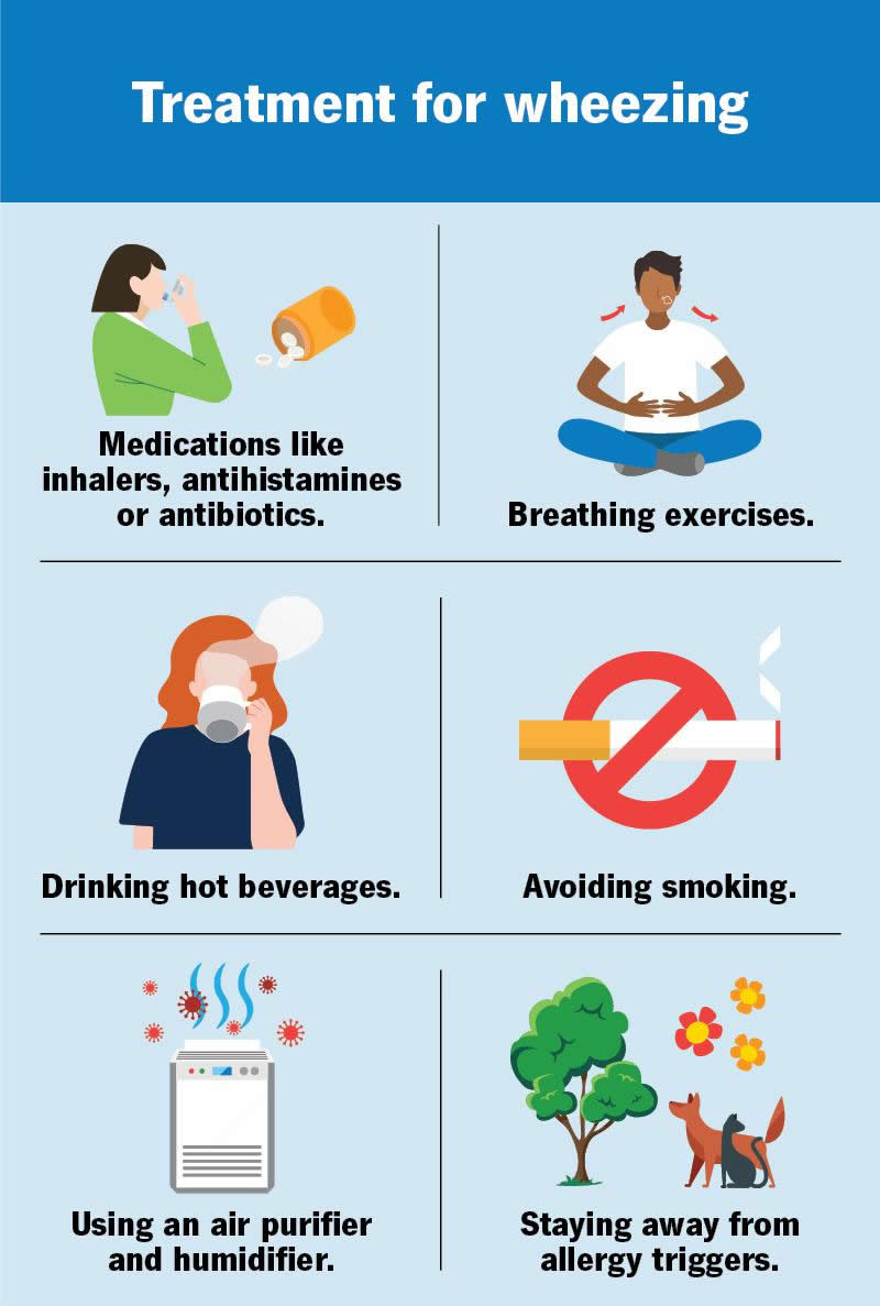 Most of the time, taking medication to treat the cause of the wheezing improves your symptoms. For example, using an inhaler for asthma or taking antibiotics for an infection usually helps.