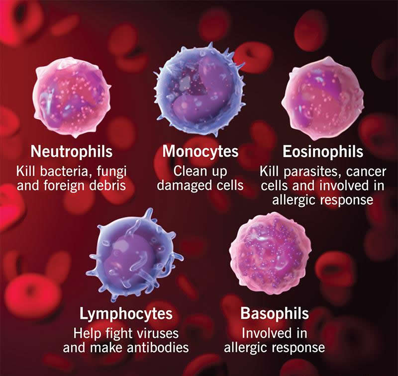 White blood cells are a part of your immune system that protects your body from infection. These cells circulate through your bloodstream and tissues to respond to injury or illness by attacking any unknown organisms that enter your body.
